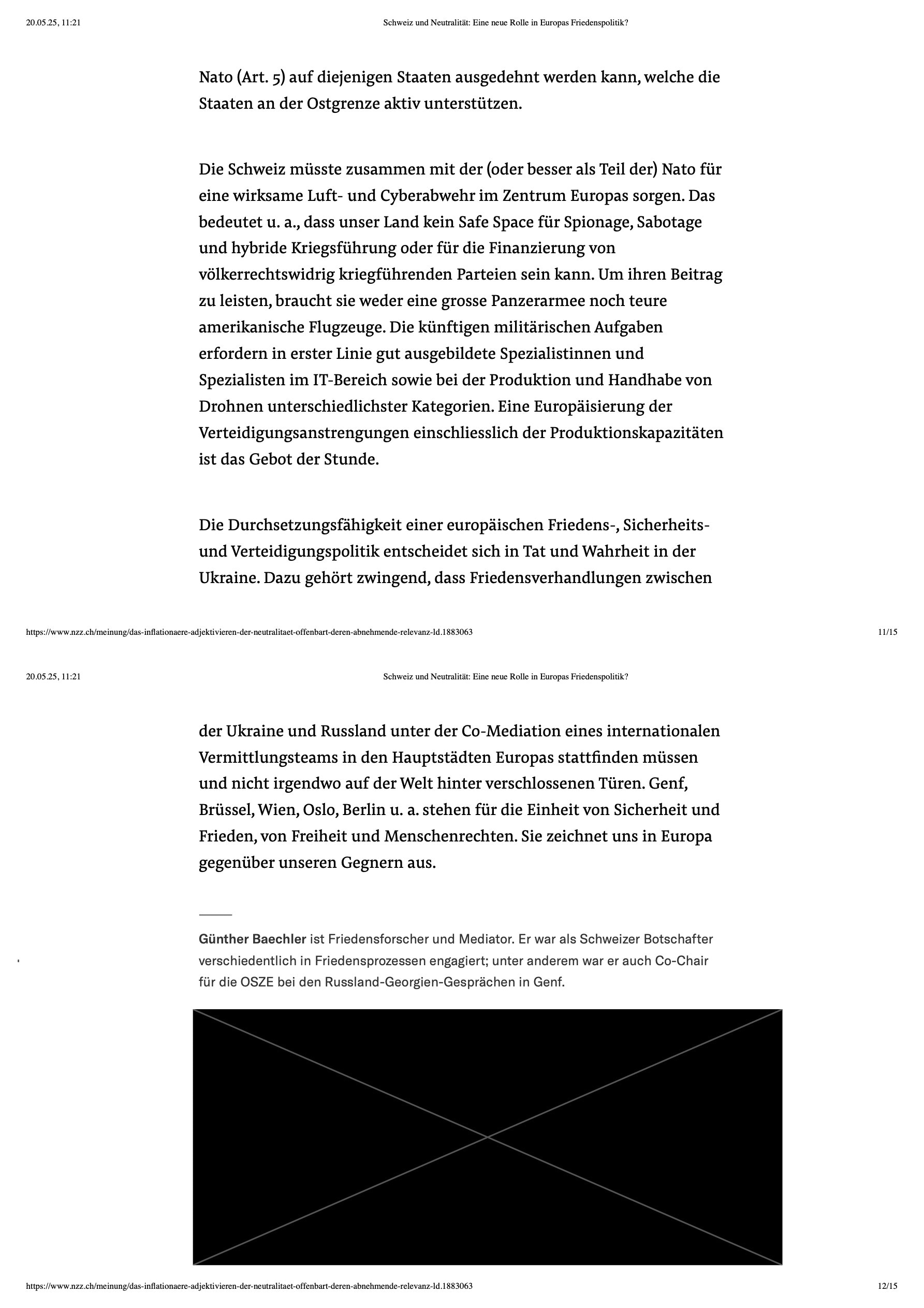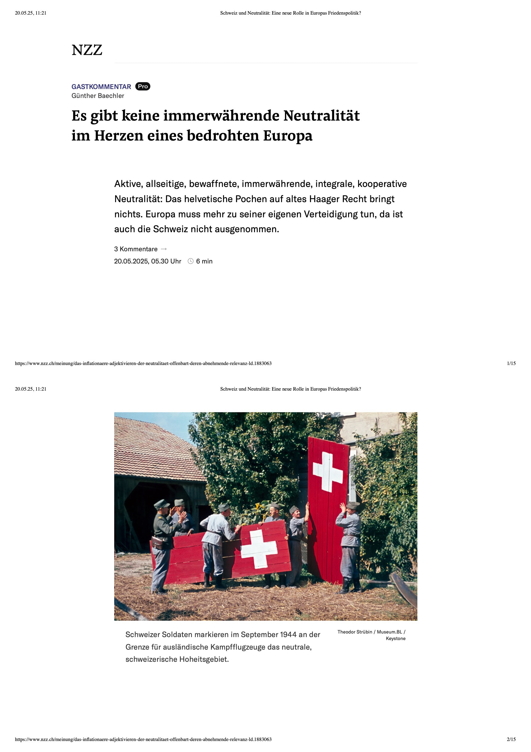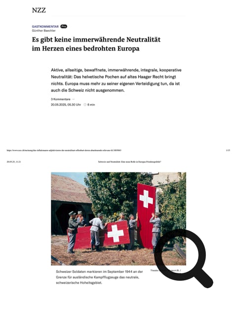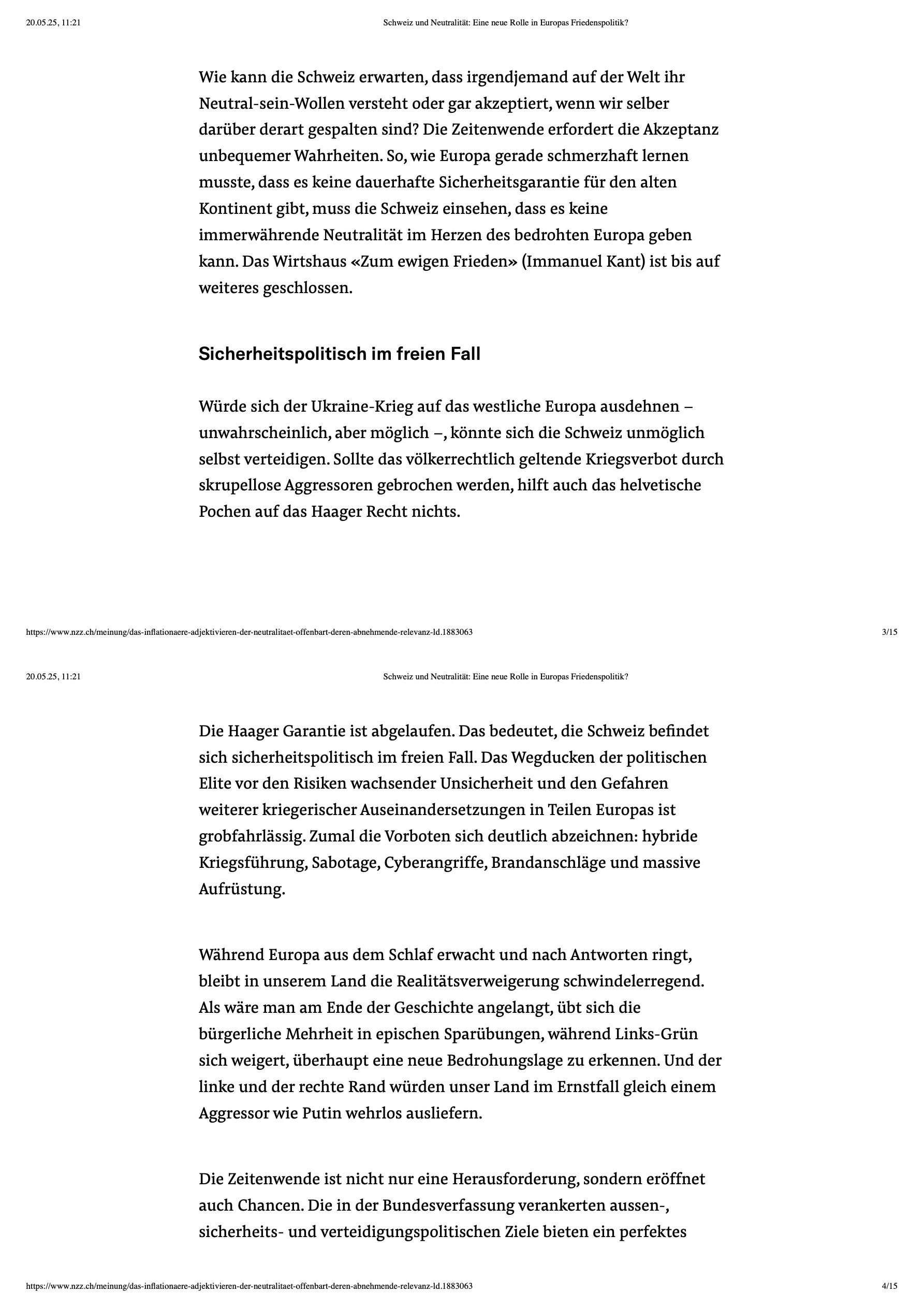 „Die Haager Garantie ist abgelaufen. Das bedeutet, die Schweiz befindet sich sicherheitspolitisch im freien Fall. Das Wegducken der politischen Elite vor den Risiken wachsender Unsicherheit und den Gefahren weiterer kriegerischer Auseinandersetzungen in Teilen Europas ist grobfahrlässig. Zumal die Vorboten sich deutlich abzeichnen: hybride Kriegsführung, Sabotage, Cyberangriffe, Brandanschläge und massive Aufrüstung“