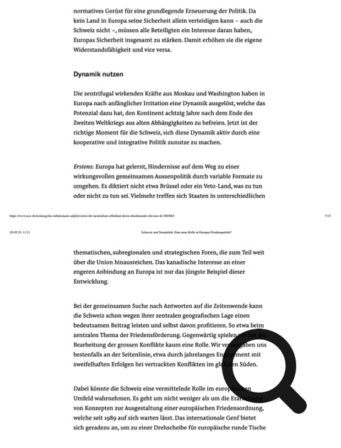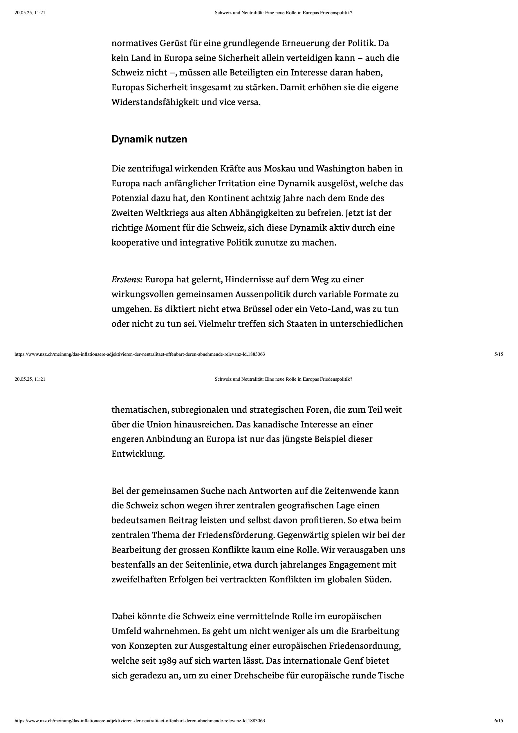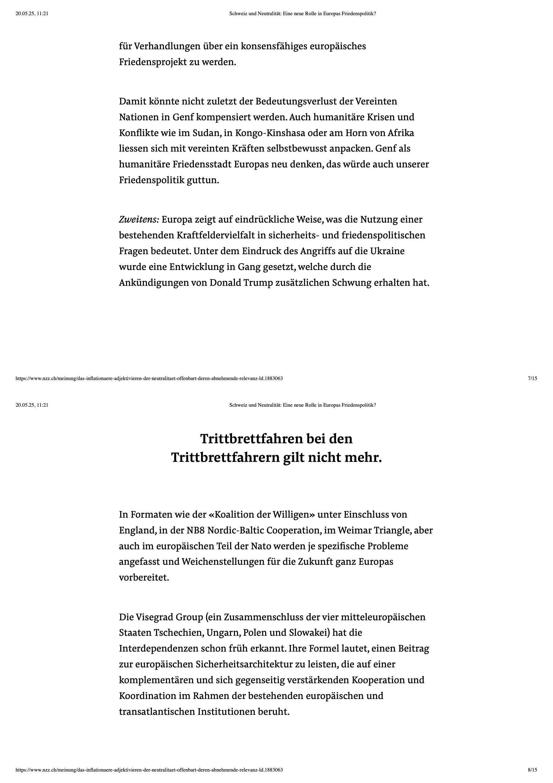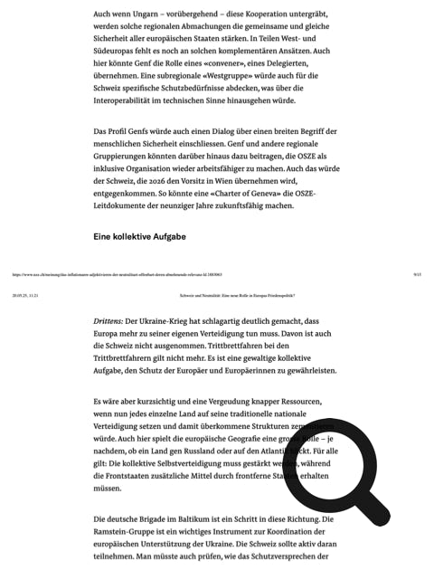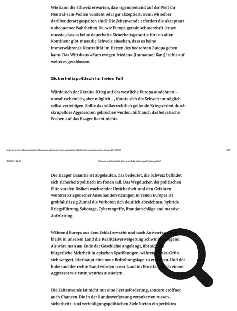 „Die Haager Garantie ist abgelaufen. Das bedeutet, die Schweiz befindet sich sicherheitspolitisch im freien Fall. Das Wegducken der politischen Elite vor den Risiken wachsender Unsicherheit und den Gefahren weiterer kriegerischer Auseinandersetzungen in Teilen Europas ist grobfahrlässig. Zumal die Vorboten sich deutlich abzeichnen: hybride Kriegsführung, Sabotage, Cyberangriffe, Brandanschläge und massive Aufrüstung“